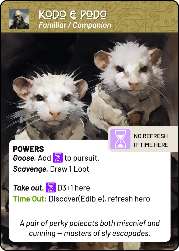 I edited a few denizen cards to be more in line with your current designs. I like your decision to put one of the icons in the same box as the stats (I wish I had thought of that!), but I think it would be more logical to have Guarded there, as it’s a status that directly relates to combat. Hunter/Rooted on the other hand feels more like an identity rather than a combat status, so I feel it belongs next to the title.