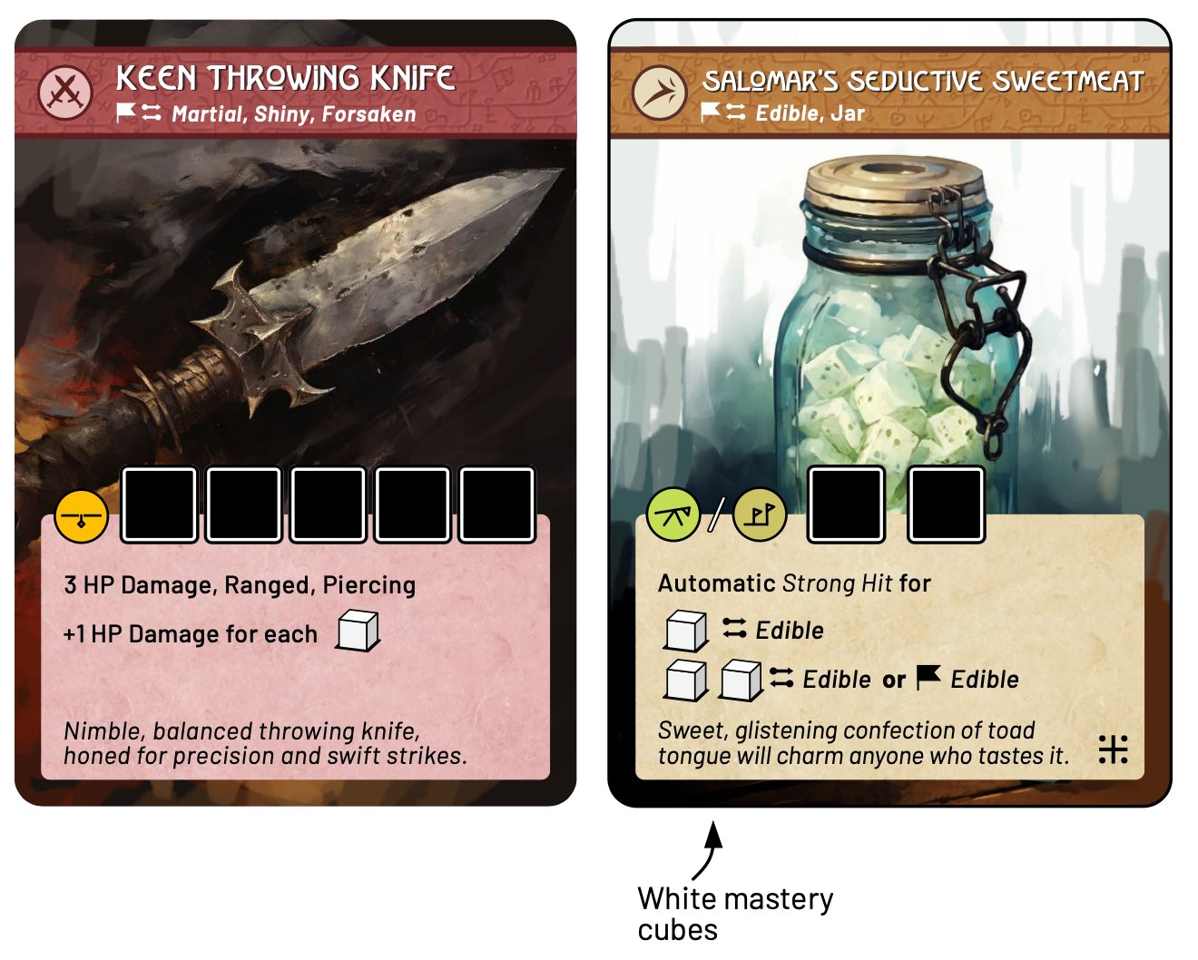 I updated a few Item designs to reflect the latest Denizen designs - i.e. flat rounded text boxes instead of 3D, and full width title masthead, and the parley icons in the masthead instead of in a separate box. I returned the item type icon (quick, combat, etc) to the masthead. This means the longest titles (like Salomar’s) have to be shrunk down a bit, but it makes the identity of the card clearer.