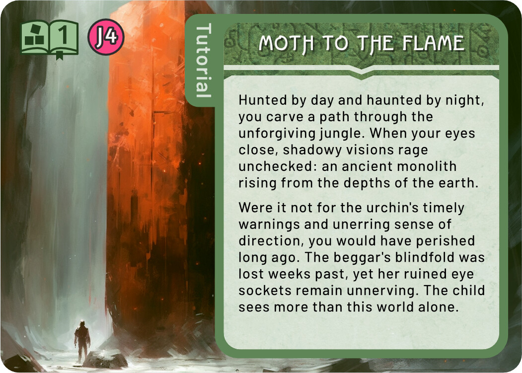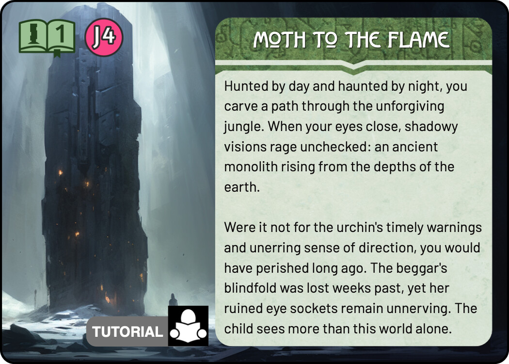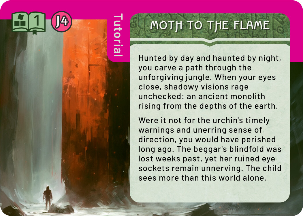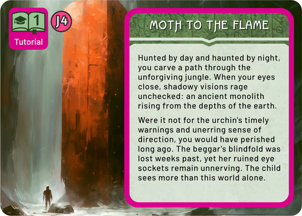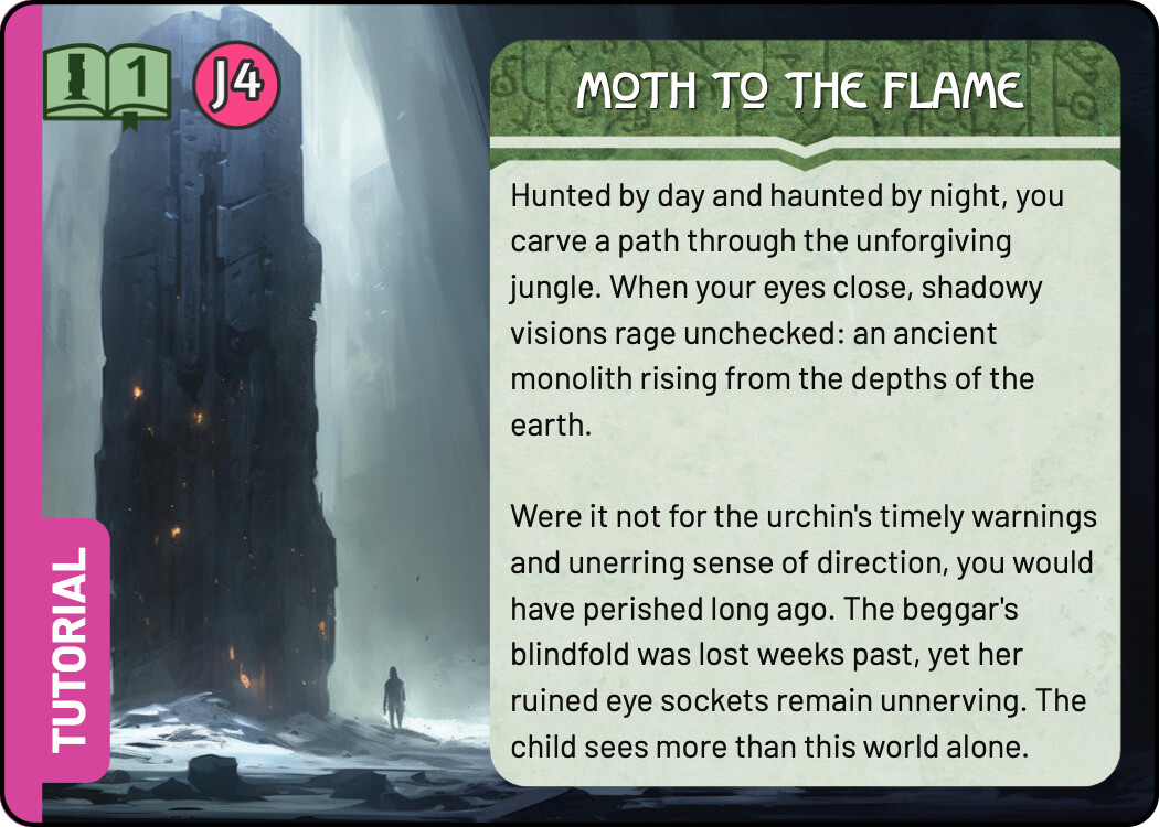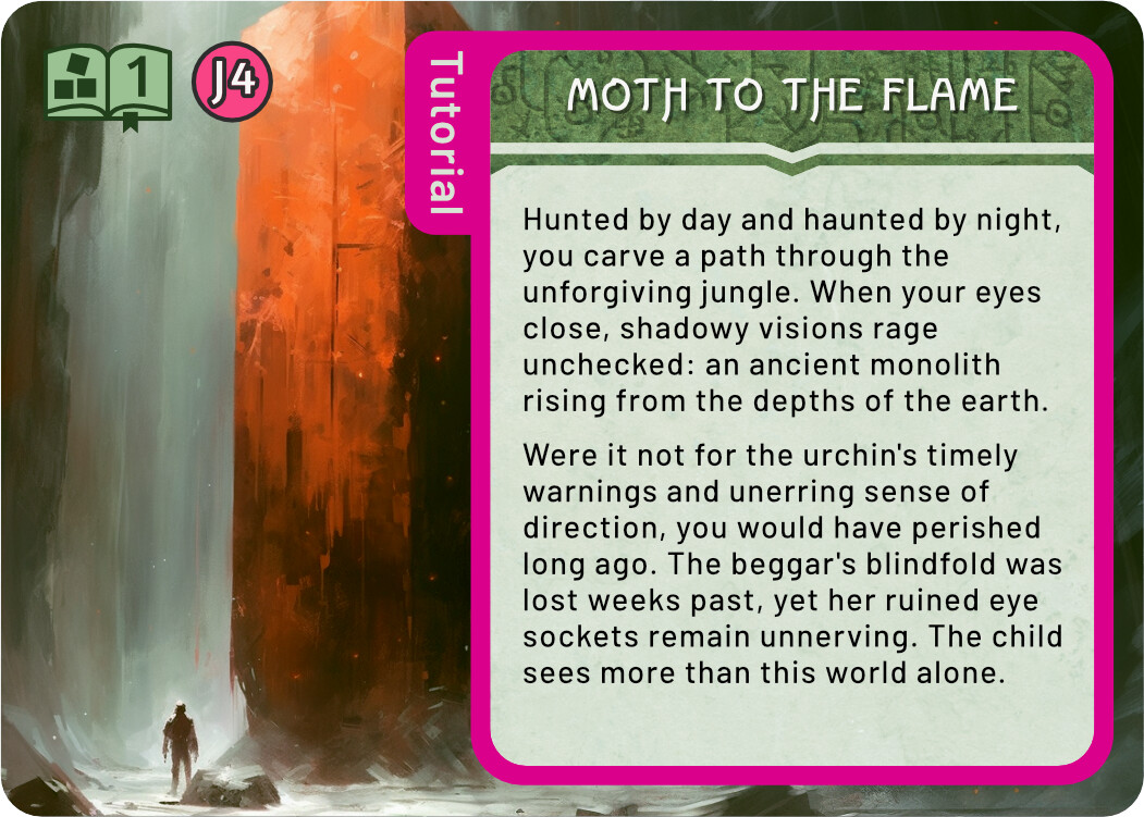 And finally a few quick sketches for the Tutorial. I think keeping the tutorial colour scheme the same as the real Monolith quest is not a terrible idea - it tells you that this is really the same quest, but simplified. At the same time, I liked the blue line you used in the previous prototype, it easily sets those cards aside. For these sketches I chose the complementary colour to green, an eye catching magenta. There are many ways to use this accent colour, these are some quick and dirty ideas.