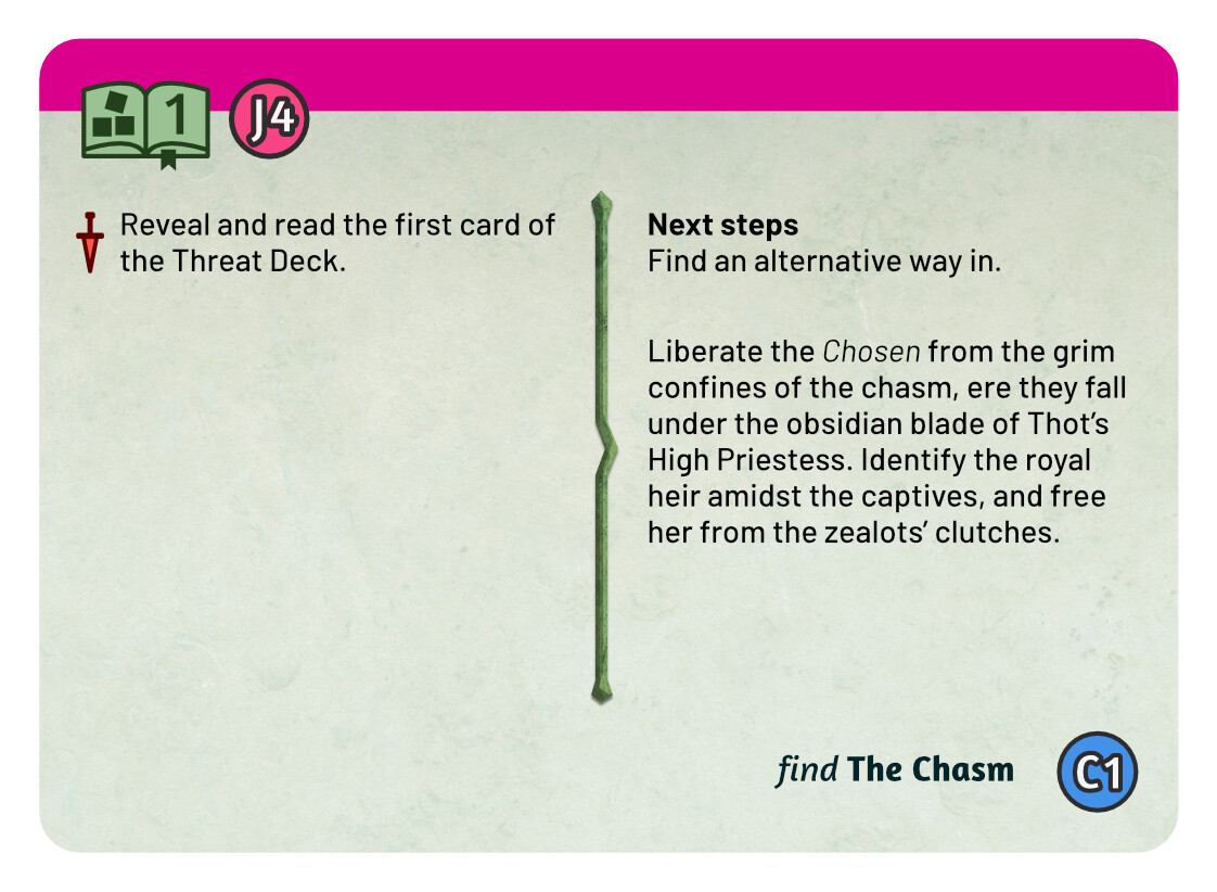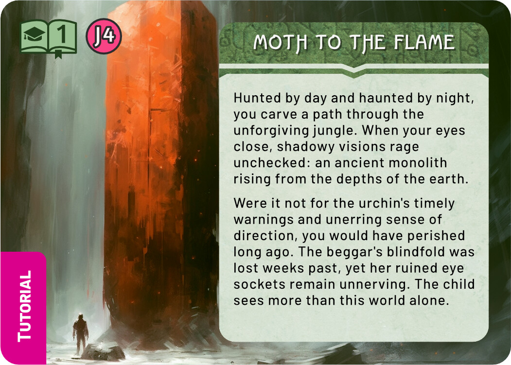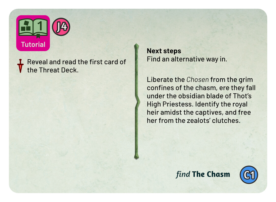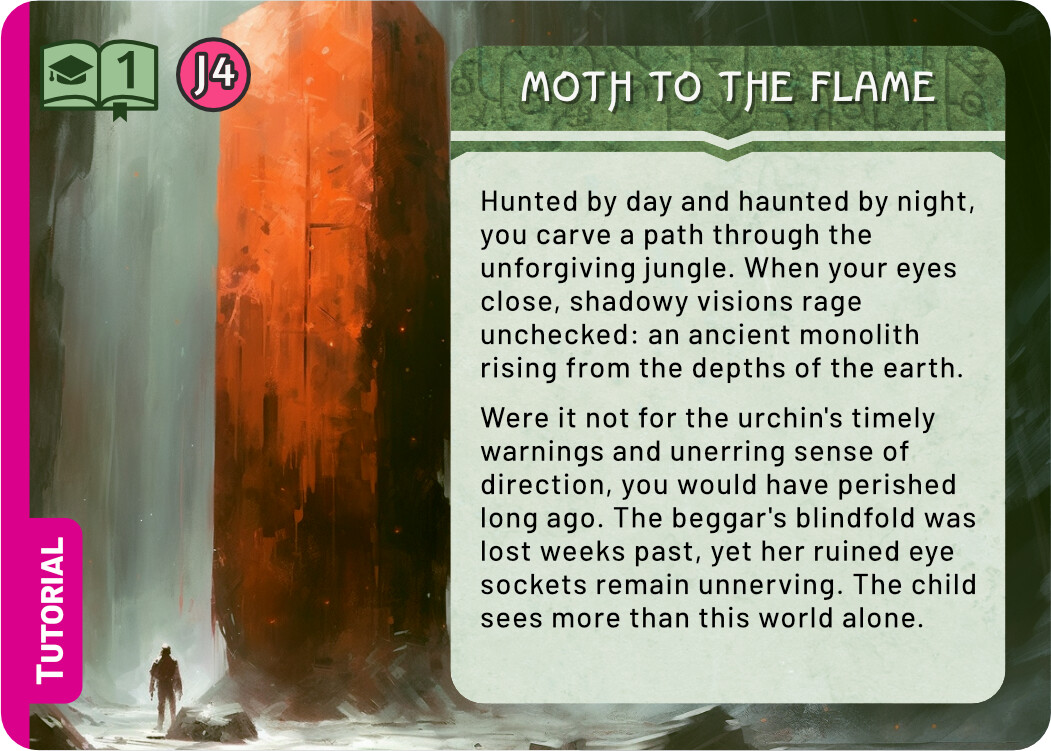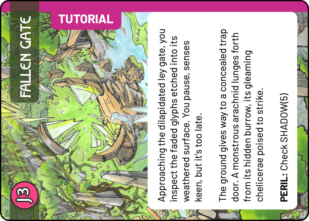And finally a few quick sketches for the Tutorial. I think keeping the tutorial colour scheme the same as the real Monolith quest is not a terrible idea - it tells you that this is really the same quest, but simplified. At the same time, I liked the blue line you used in the previous prototype, it easily sets those cards aside. For these sketches I chose the complementary colour to green, an eye catching magenta. There are many ways to use this accent colour, these are some quick and dirty ideas.