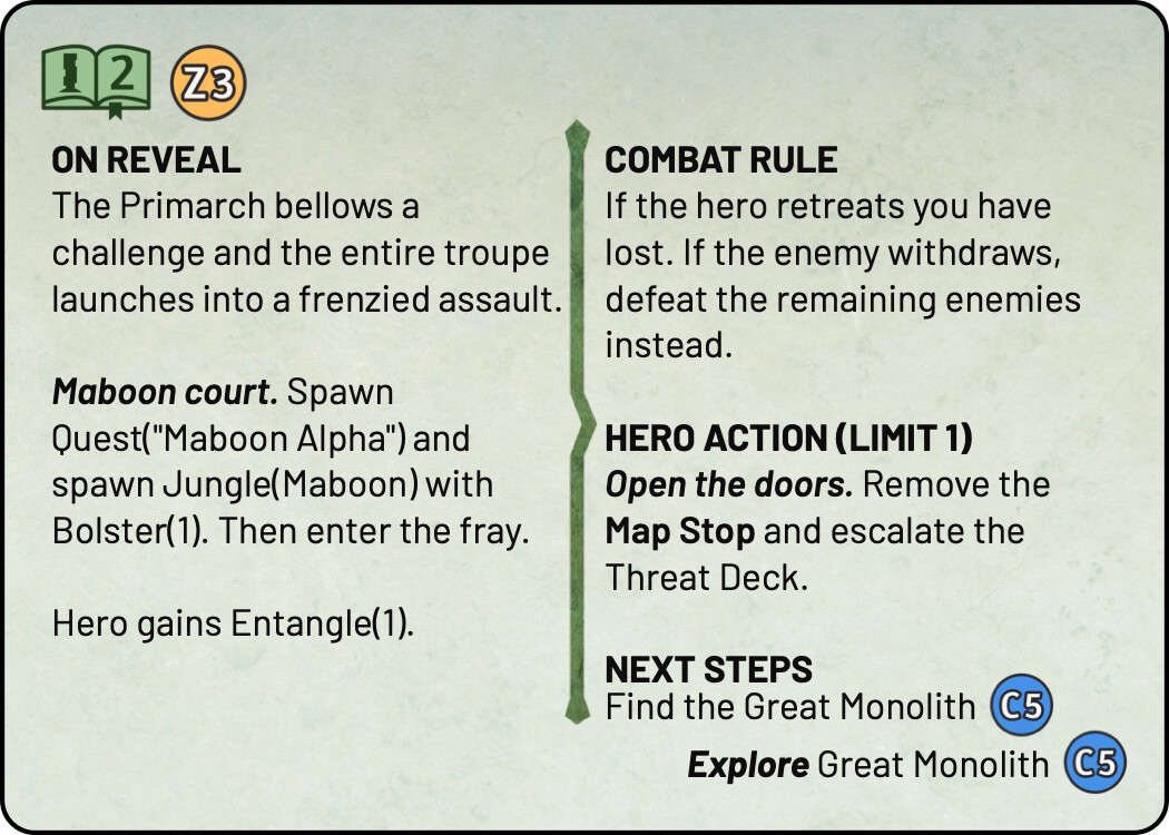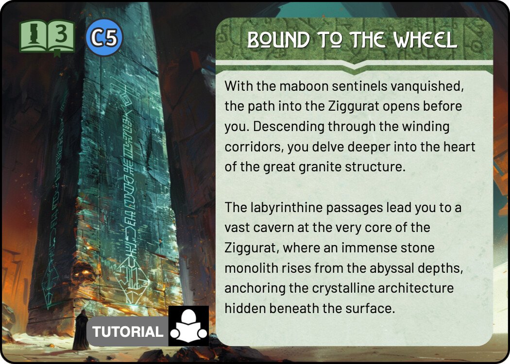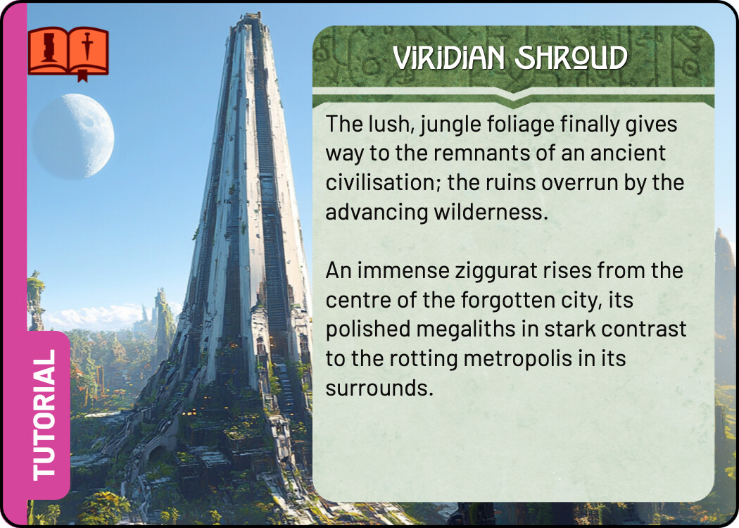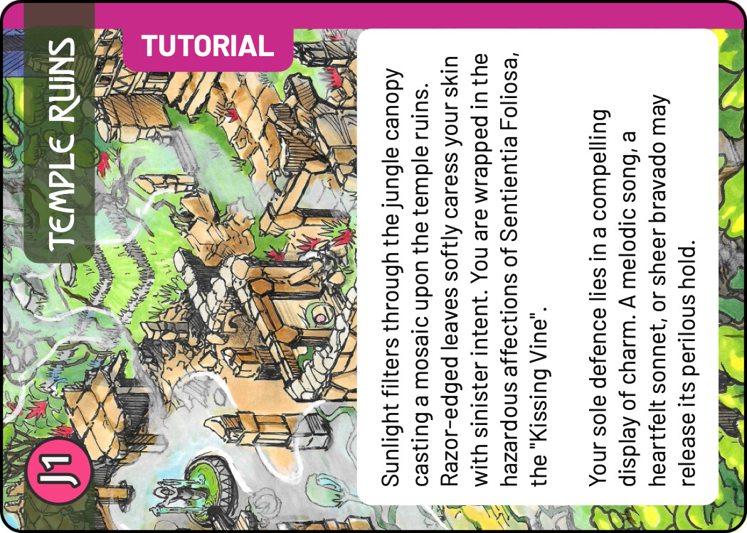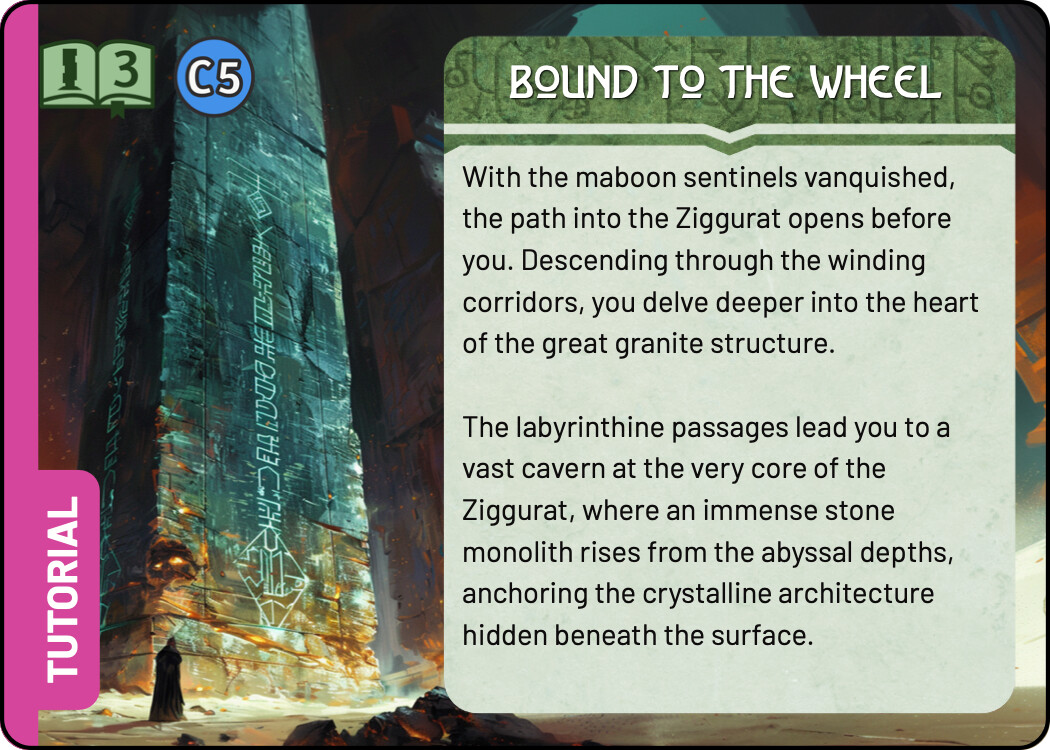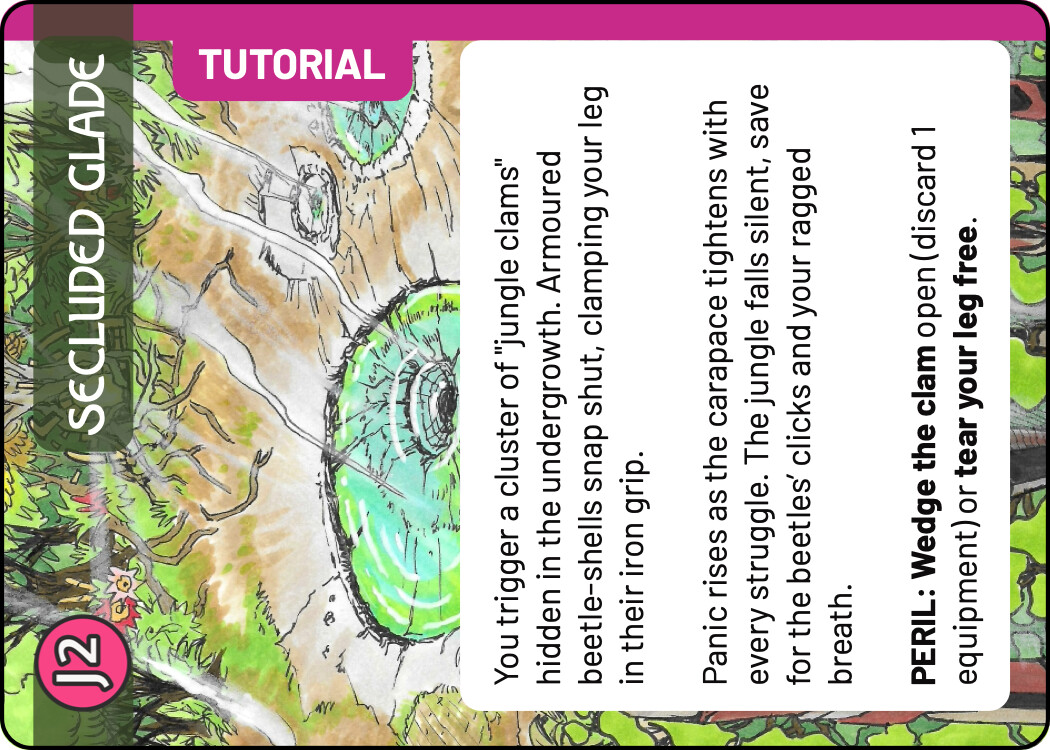 And finally a few quick sketches for the Tutorial. I think keeping the tutorial colour scheme the same as the real Monolith quest is not a terrible idea - it tells you that this is really the same quest, but simplified. At the same time, I liked the blue line you used in the previous prototype, it easily sets those cards aside. For these sketches I chose the complementary colour to green, an eye catching magenta. There are many ways to use this accent colour, these are some quick and dirty ideas.