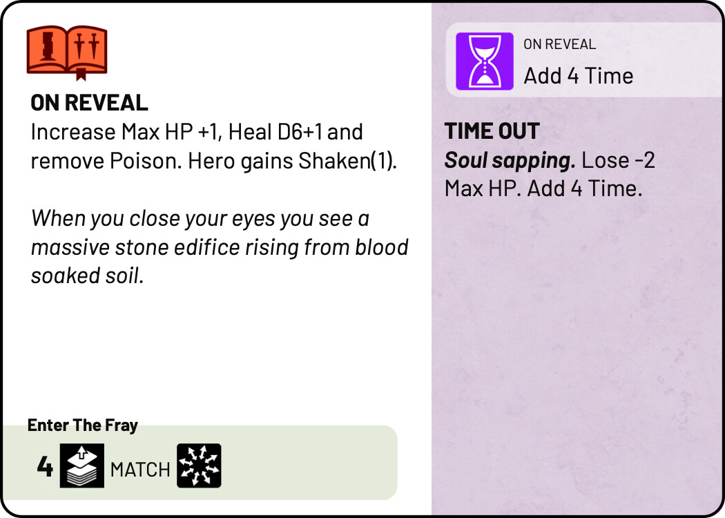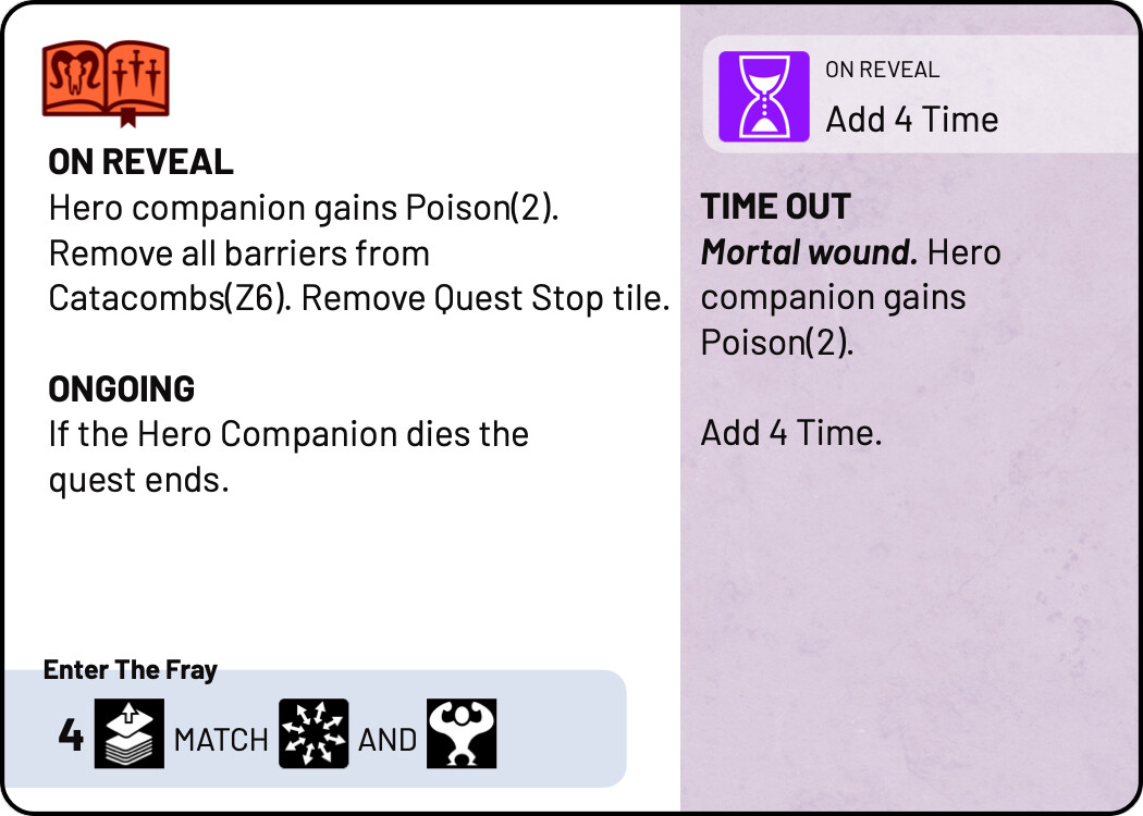 The purple paper background for TIME pools looks good on its own, but a bit manky when combined with the paper colour of the quest palette. Have included examples of just the purple, with an “enter the fray” call out in the colour of the quest palette.